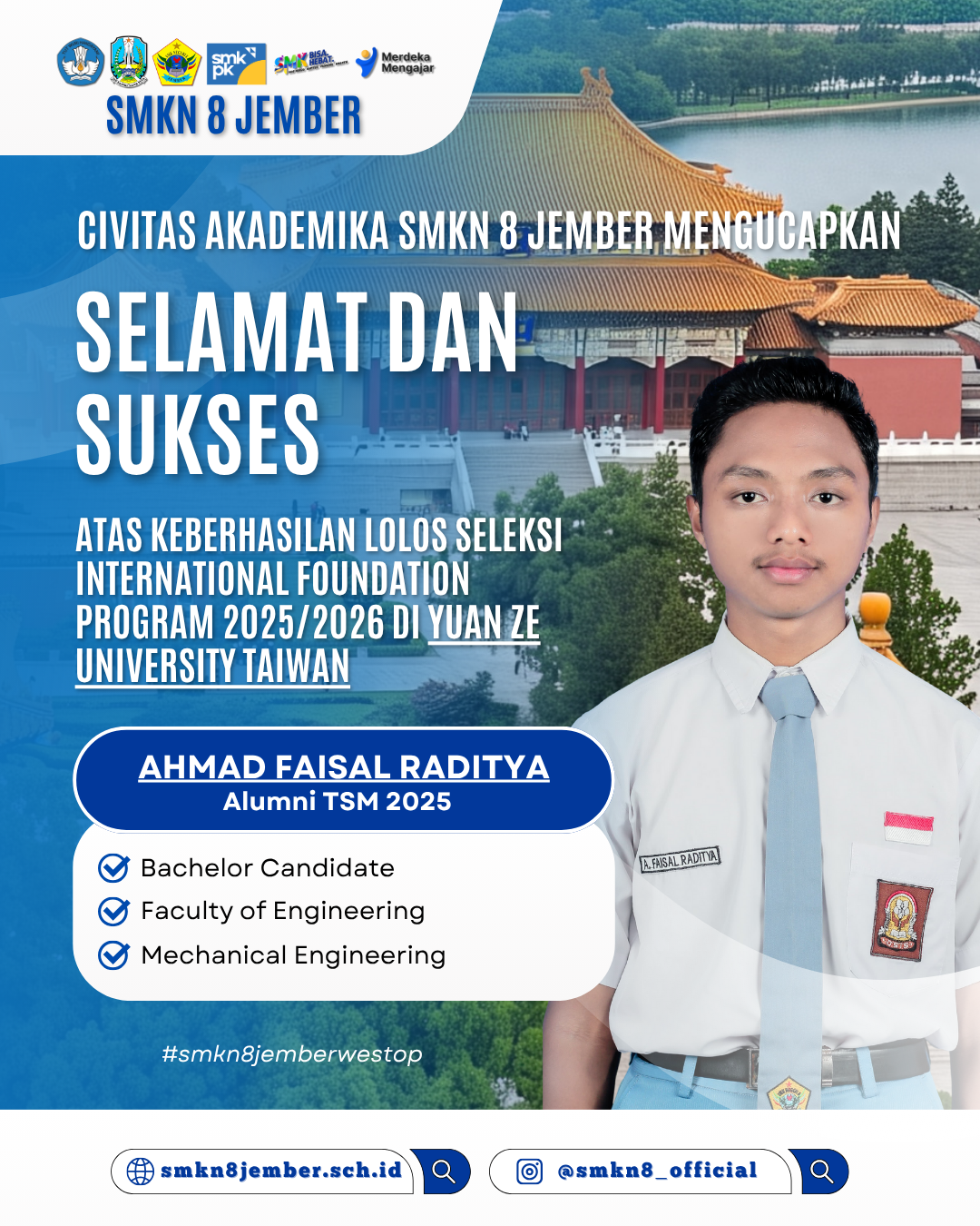 Untuk adik-adik yang saat ini masih bersekolah di SMKN 8 Jember, yuk terus asah kemampuan dan pengalaman kalian, karena kalian juga kedepannya berkesempatan untuk dapat mengikuti jejak dari Kak Faisal dengan melanjutkan pendidikan di Luar Negeri.