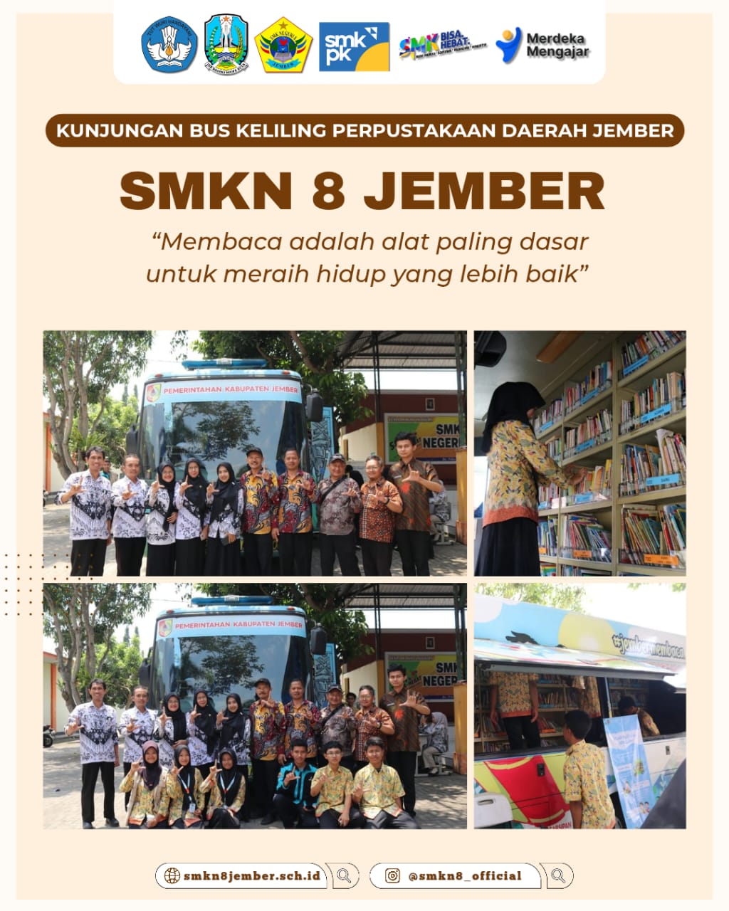 SMKN 8 Jember baru-baru ini mendapat kunjungan dari Perpustakaan Daerah (Perpusda) Kabupaten Jember melalui program “Bus Keliling”. Kegiatan ini bertujuan untuk meningkatkan minat baca dan kesadaran akan pentingnya literasi di kalangan siswa.