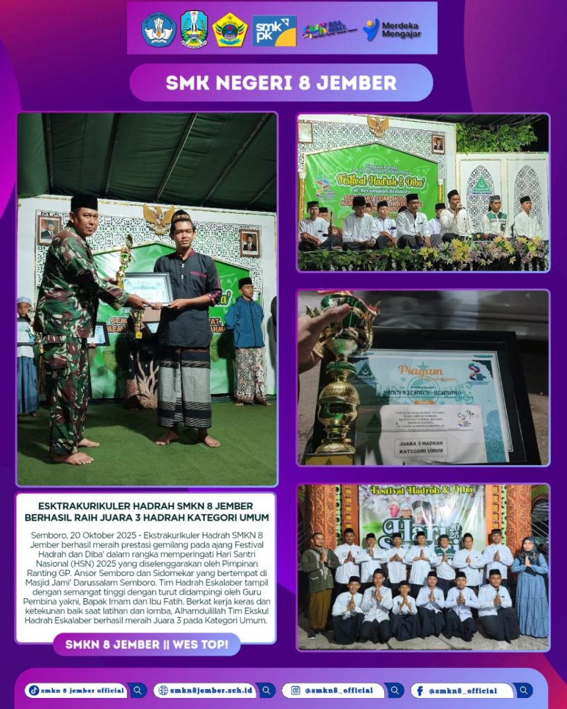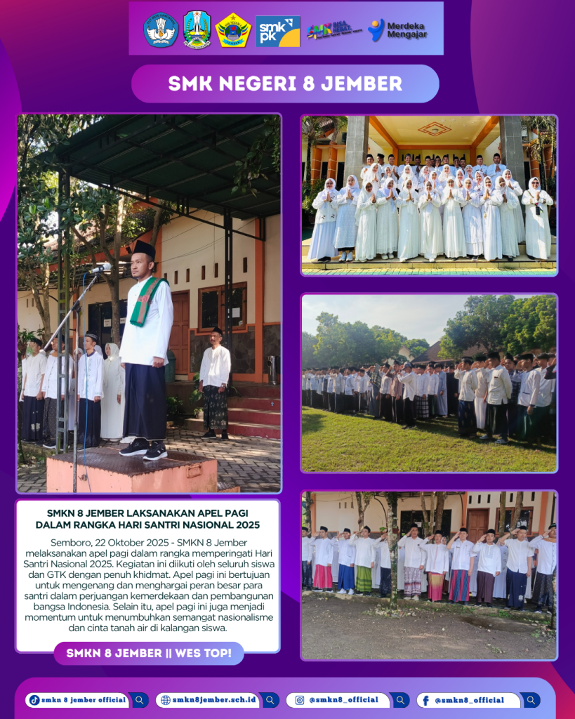 ESKALABER NEWS SMKN 8 Jember melaksanakan apel pagi dalam rangka memperingati Hari Santri Nasional 2025 pada Rabu, 22 Oktober 2025. Kegiatan ini diikuti oleh seluruh siswa dan guru dengan penuh khidmat. Dalam apel tersebut, siswa-siswa dan guru mengikuti berbagai rangkaian Baca Selengkapnya