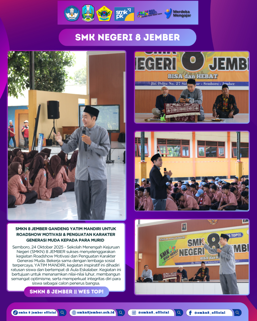 Sekolah Menengah Kejuruan Negeri (SMKN) 8 JEMBER sukses menyelenggarakan kegiatan Roadshow Motivasi dan Penguatan Karakter Generasi Muda. Bekerja sama dengan lembaga sosial terpercaya, YATIM MANDIRI, kegiatan inspiratif ini dihadiri ratusan siswa dan bertempat di Aula Eskalaber.