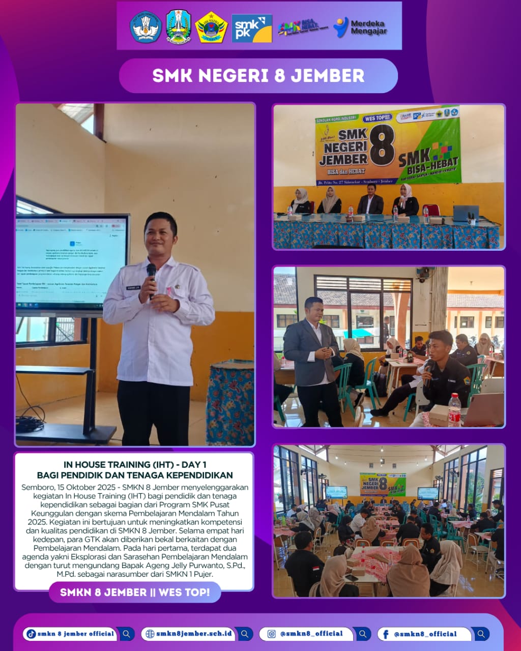 SMKN 8 Jember menyelenggarakan kegiatan In House Training (IHT) bagi pendidik dan tenaga kependidikan sebagai bagian dari Program SMK Pusat Keunggulan dengan skema Pembelajaran Mendalam Tahun 2025. Kegiatan ini bertujuan untuk meningkatkan kompetensi dan kualitas pendidikan di SMKN 8 Jember.