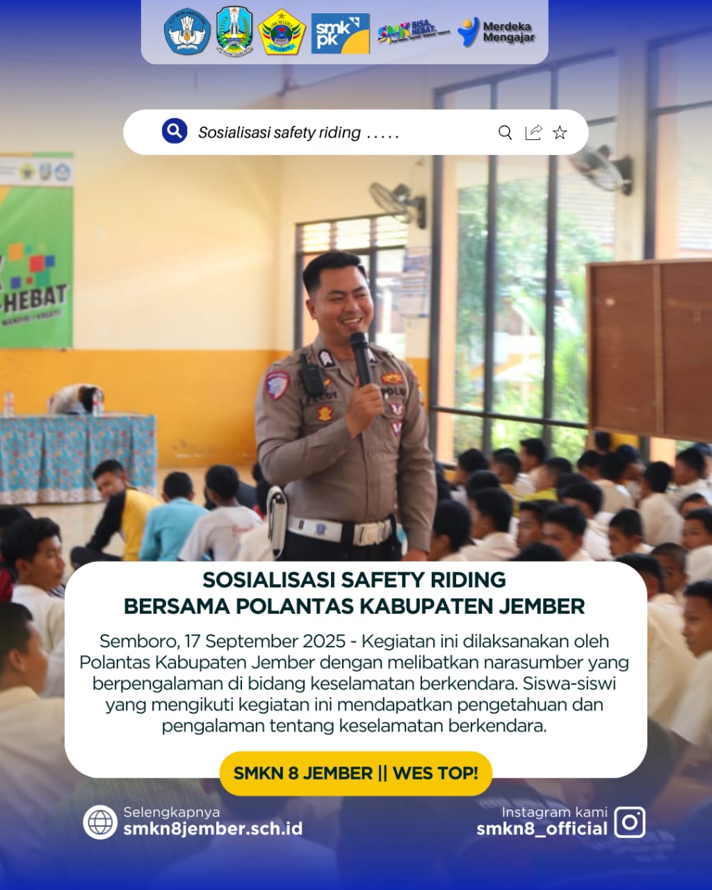SMKN 8 Jember baru-baru ini menyelenggarakan kegiatan Sosialisasi Safety Riding bersama Polantas Kabupaten Jember. Kegiatan ini bertujuan untuk meningkatkan kesadaran dan pengetahuan siswa tentang keselamatan berkendara di jalan raya.